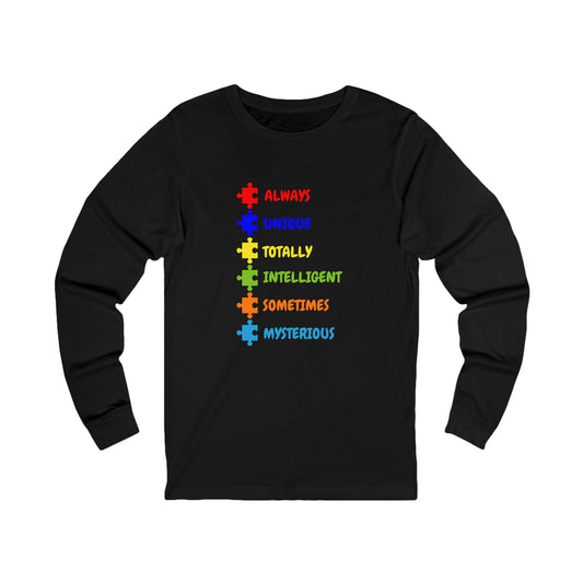 Autism Puzzle Piece Long Sleeve Tee - "Always, Unique, Totally, Intelligent, Sometimes, Mysterious"