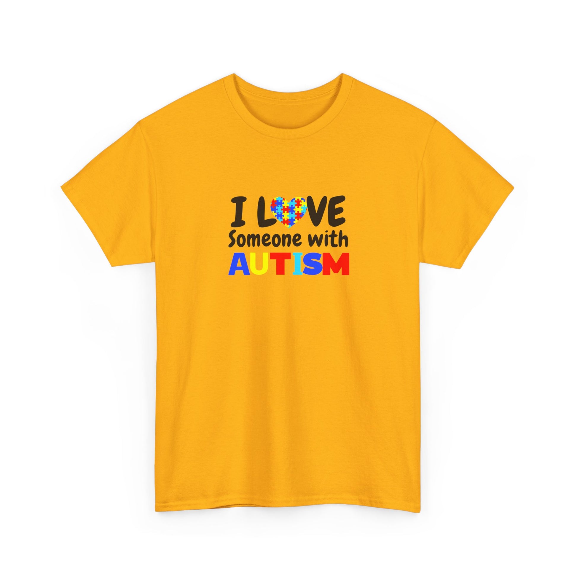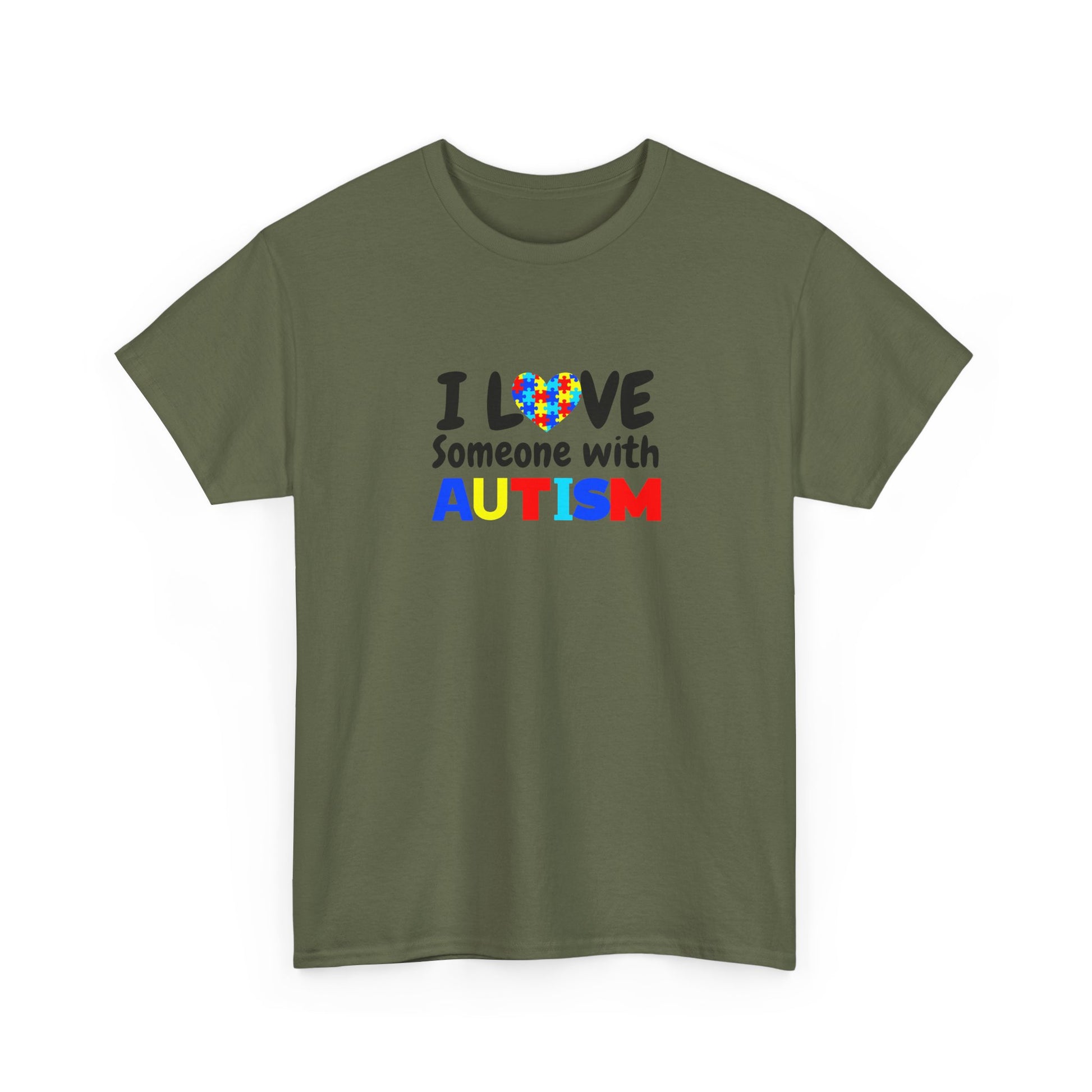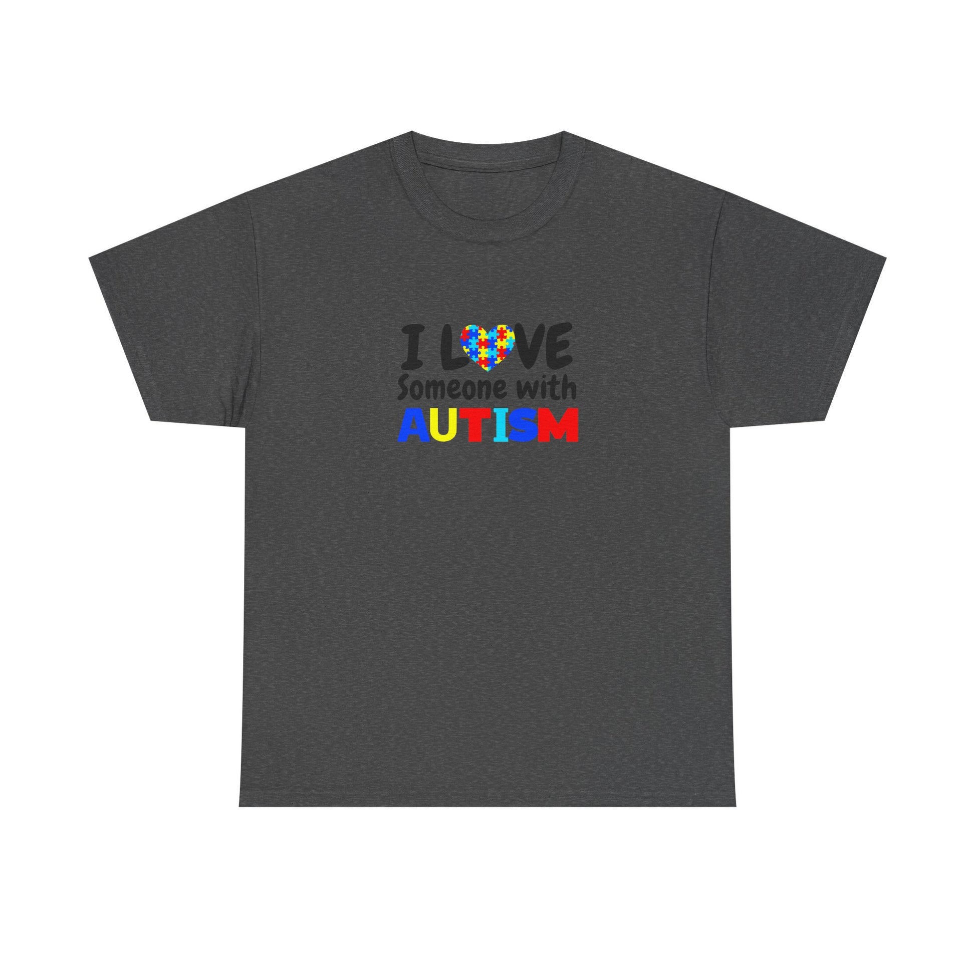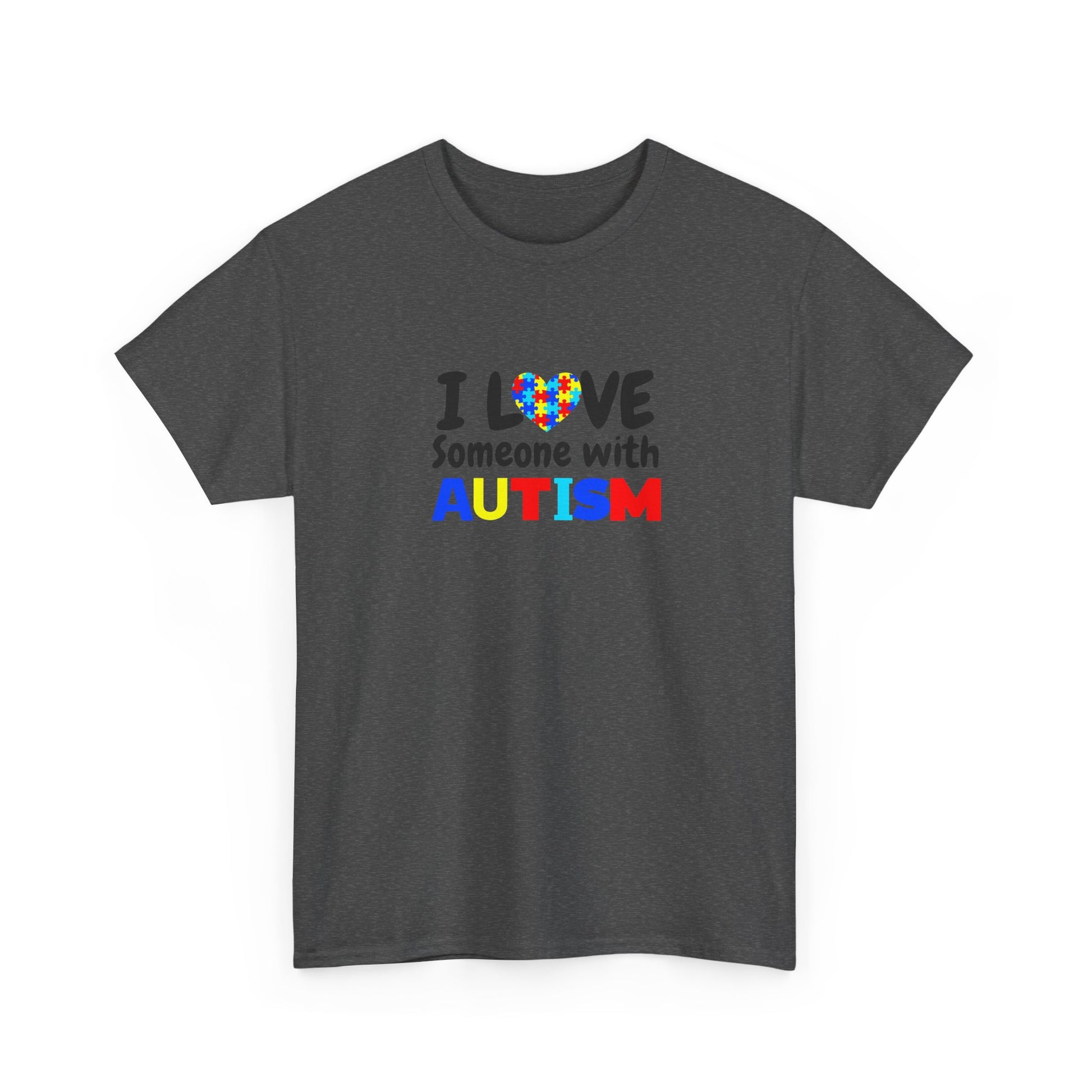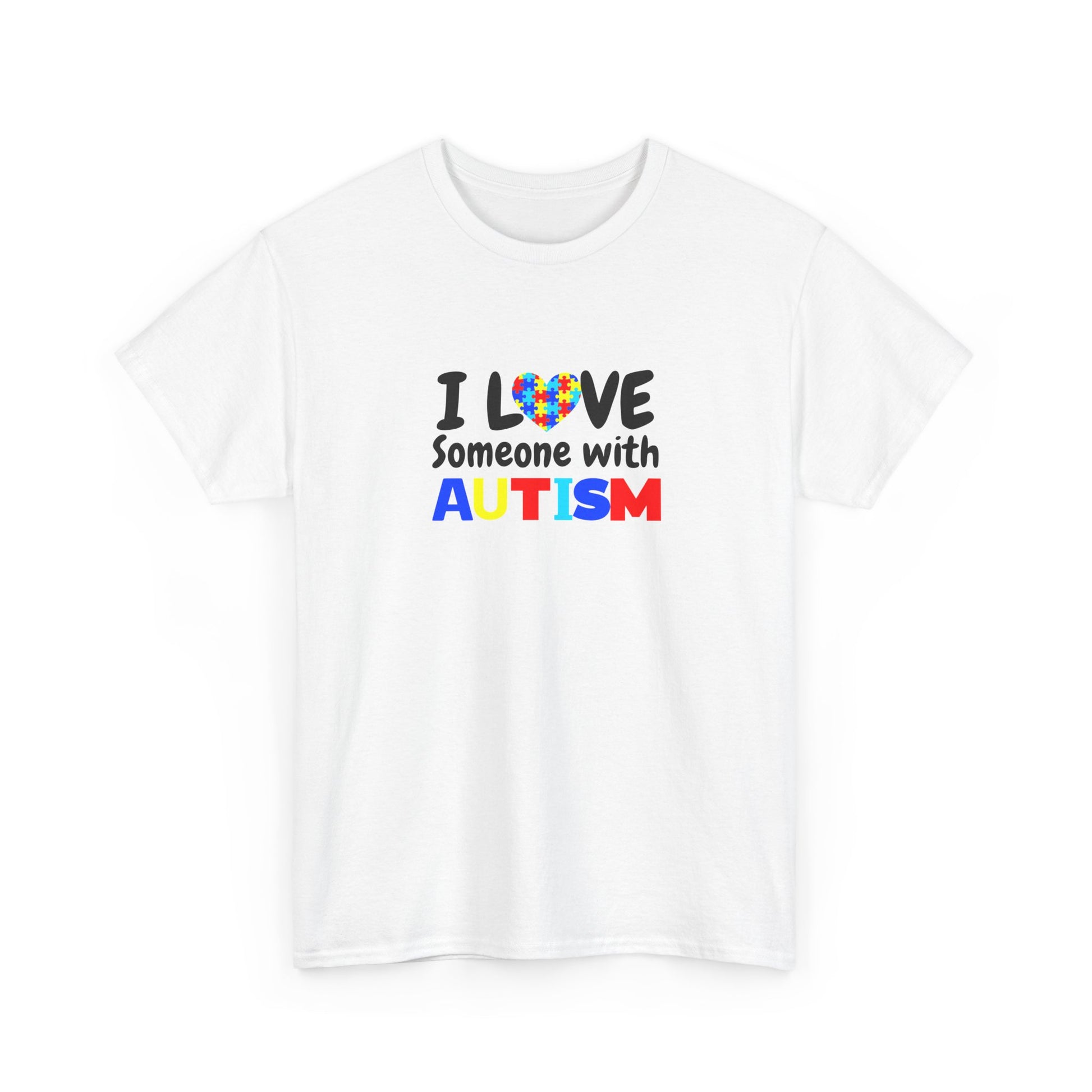 T-Shirt that speaks from the heart. Soft, sturdy cotton holds a bright, simple design that reads “I LOVE Someone with AUTISM” with a colorful heart puzzle motif. It feels like wearing support — calm, straightforward, and sincere. The classic crew neckline and relaxed fit let this tee move with you during school pick-ups, therapy sessions, community walks, or quiet weekend errands. The print sits cleanly on the chest so your message is visible without shouting. It’s a comfortable, everyday way to show love and solidarity with someone on the autism spectrum.